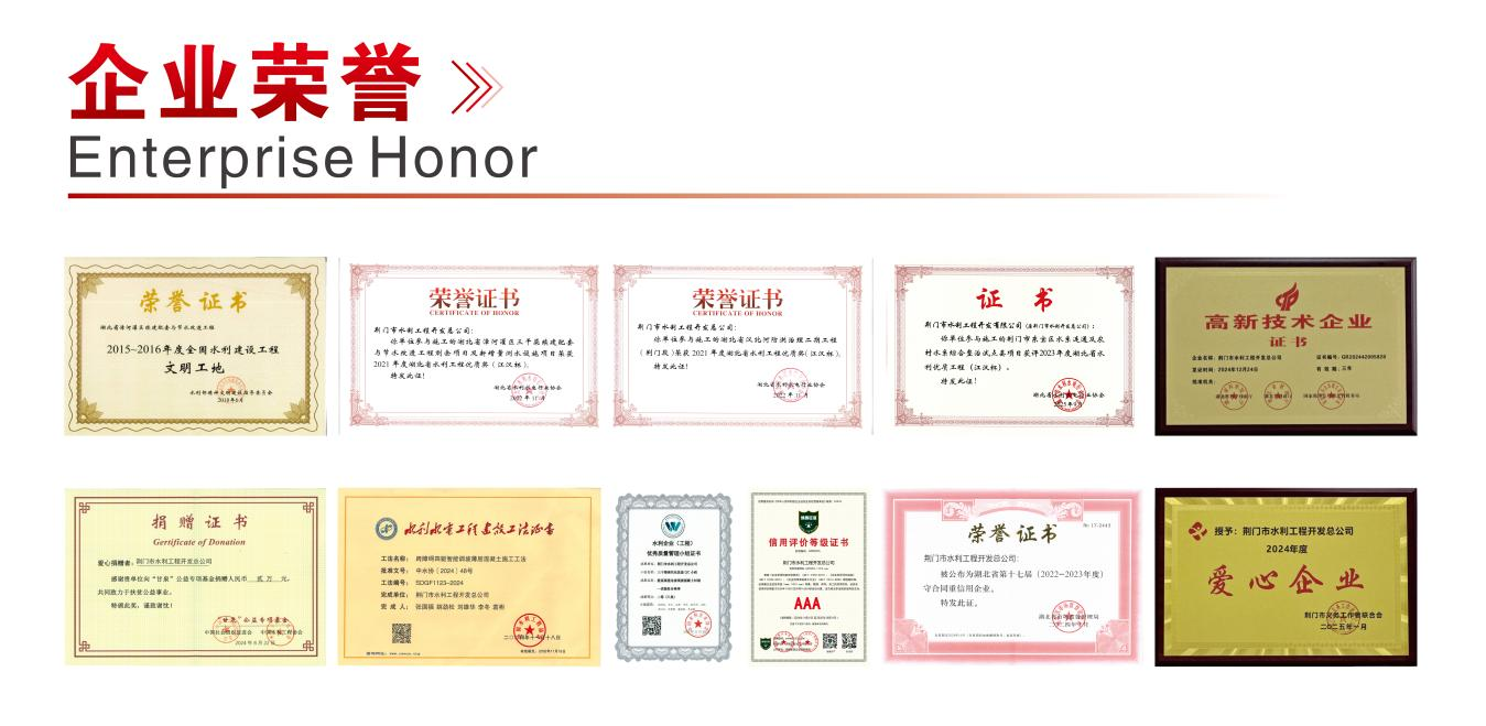連續(xù)十五年獲評省市級“守合同 重信用”單位的榮譽稱號,連續(xù)十三年榮獲ISO三體系認證證書,連續(xù)五年榮獲水利部頒發(fā)的全國水利建設市場主體信用等級AAA級證書。先后被國家、省、市主管部門授予全國企業(yè)征信系統(tǒng)立信單位、省市水利系統(tǒng)先進施工企業(yè)、先進基層黨組織、安全生產(chǎn)先進單位等榮譽稱號。