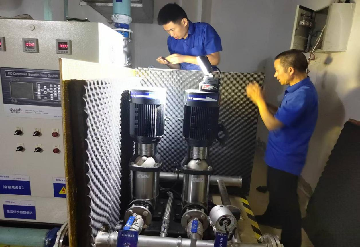 工作人員在雙喜還建小區(qū)三期水泵房加裝隔音箱